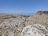 Direkt am Montag machte ich mich mit Annika und Elli, zwei Volos aus Tabgha, auf eine kleine Wanderung auf die Hörner von Hittim, dem Ort der entscheidenden Schlacht zwischen dem Kreuzfahrerherr und den Truppen Saladins 1187, was gleichzeitig auch der Anfang vom Ende für die Kreuzfahrerstaaten im Heiligen Land bedeutete. Glücklicherweise nahm uns Paul, der Volo-Verantwortliche, mit dem Auto zum Aufgang der Hörner, sodass wir von dort aus zurück in Richtung Tabgha gehen konnten. Nach dem Aufstieg auf den Berg, von dem man einen tollen Blick über die Region bis zum See hat, führte uns der Abstieg ins Moshav Kfar Zeitim. Unser Plan war nämlich auf den "Nachbarberg" des Arbels zu gelangen, der mit dem Arbel das Taubental einschließt. Leider mussten wir bald feststellen, dass es ins Taubental hinab ohne großen Umweg keinen guten Weg gibt, weshalb wir uns über und unter Zäunen und Wildtierpfaden unseren Weg bahnten. Auf dem Plateau angekommen, wurden wir immerhin mit dem Blick auf einige Schakale belohnten, die offenbar "Jagd" auf eine Gazelle machten, oder dies zumindest versuchten. In der Mangoplantage konnten wir uns dann endlich auch im Schatten ein wenig ausruhen und die ersten Mangos des Jahres kosten. Am Ende des Plateaus hat man dann eine wunderbare Aussicht auf den See!